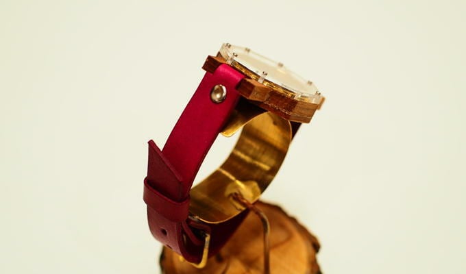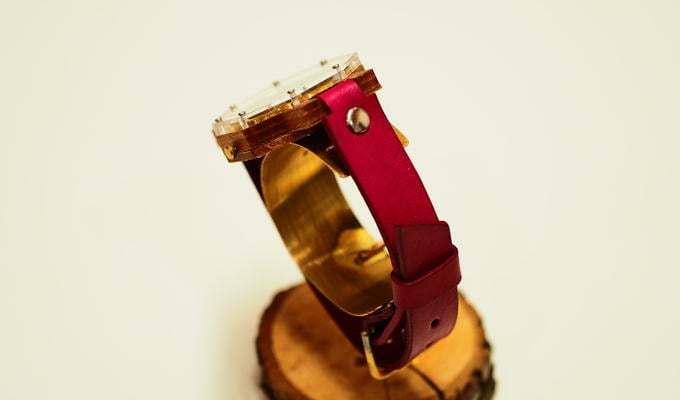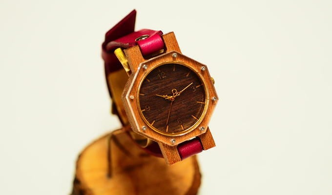 一つ一つ手作業で産み出し、材木に桜を使用した木製腕時計。