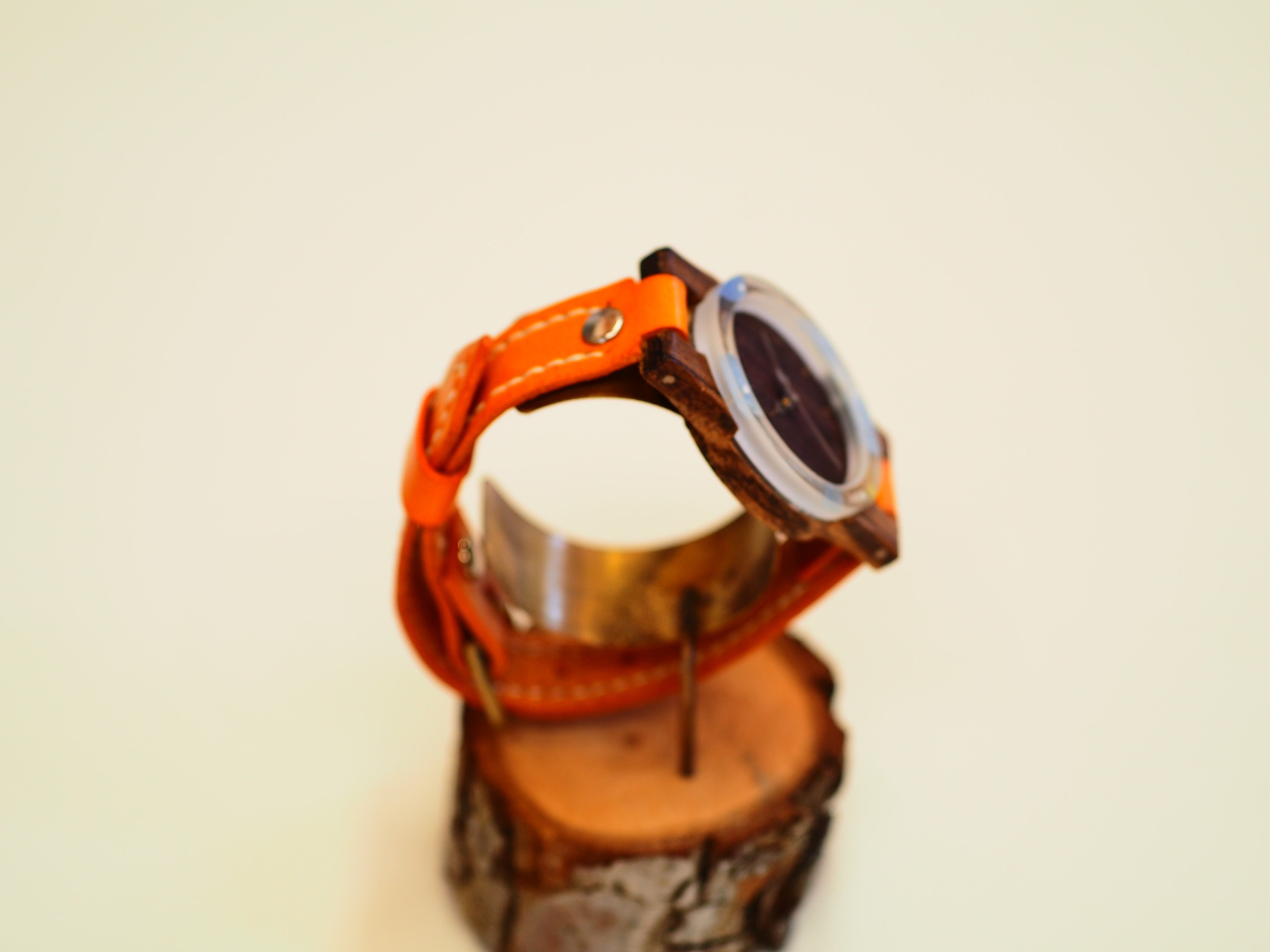 ベルトはレザーにしたので、サイズ調整も楽にでき、木・革の味わいを楽しめる時計となっています。