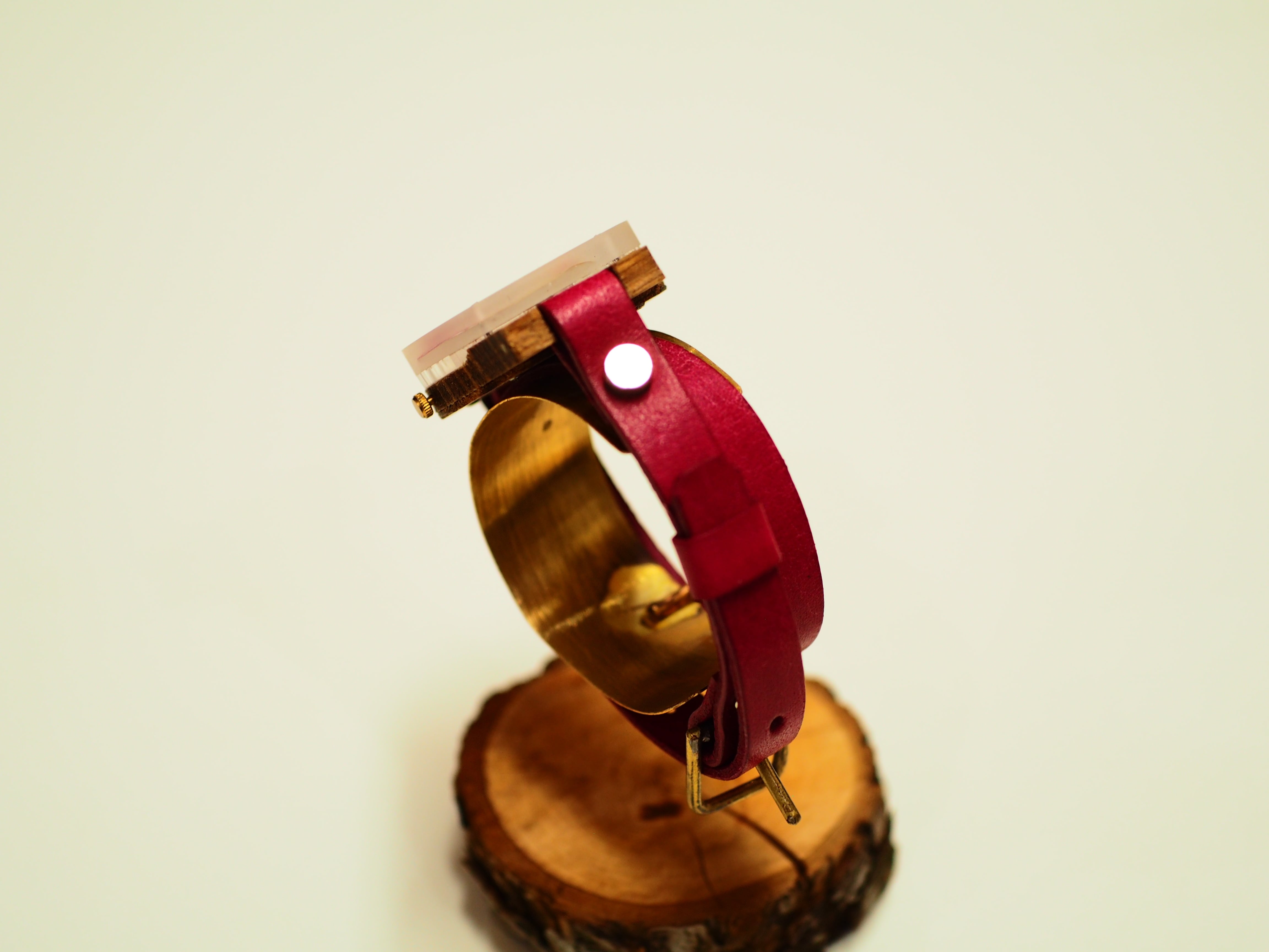 ベルトはレザーにしたので、サイズ調整も楽にでき、木・革の味わいを楽しめる時計となっています。
