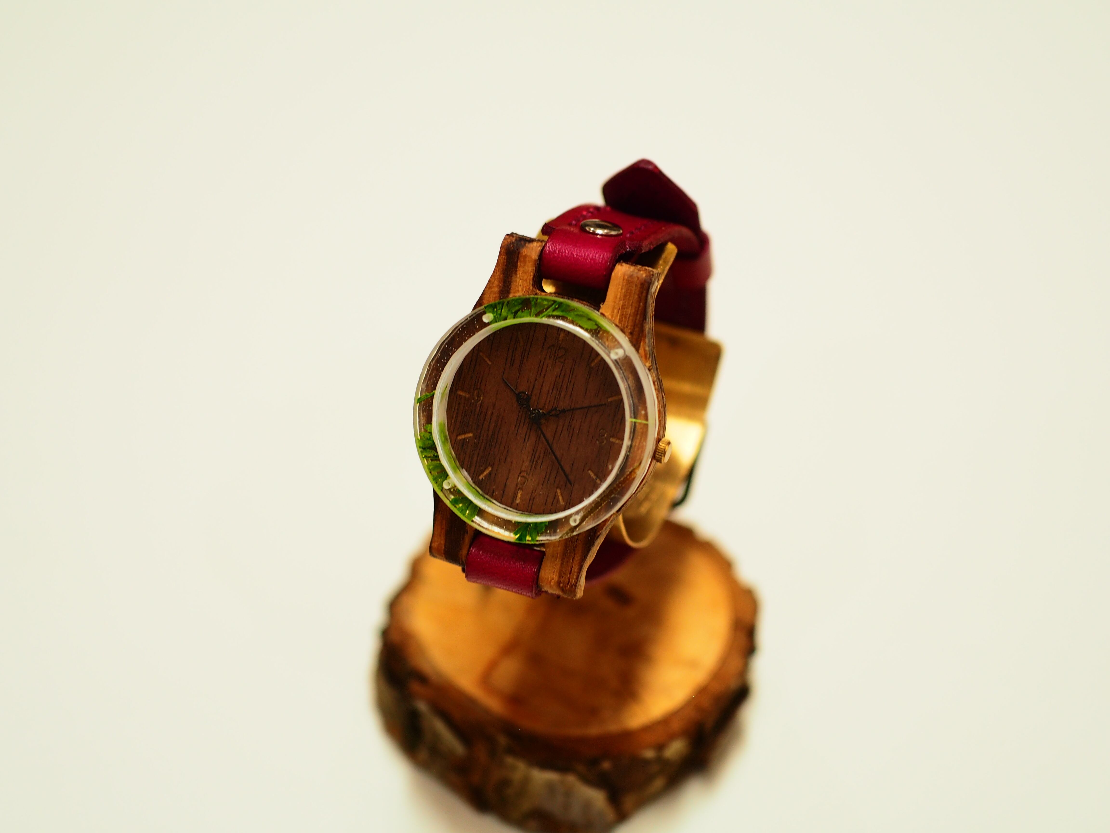 ベルトはレザーにしたので、サイズ調整も楽にでき、木・革の味わいを楽しめる時計となっています。