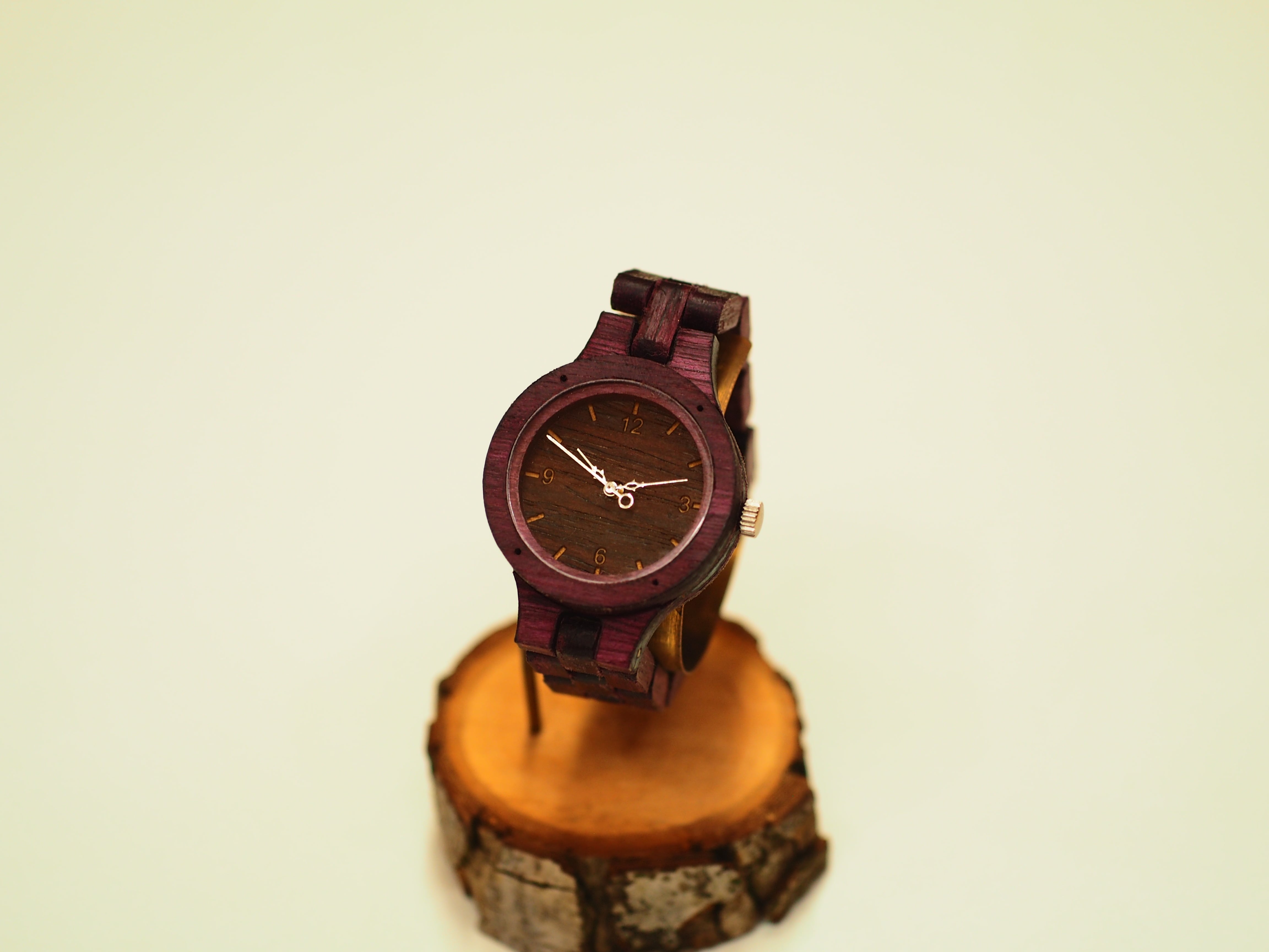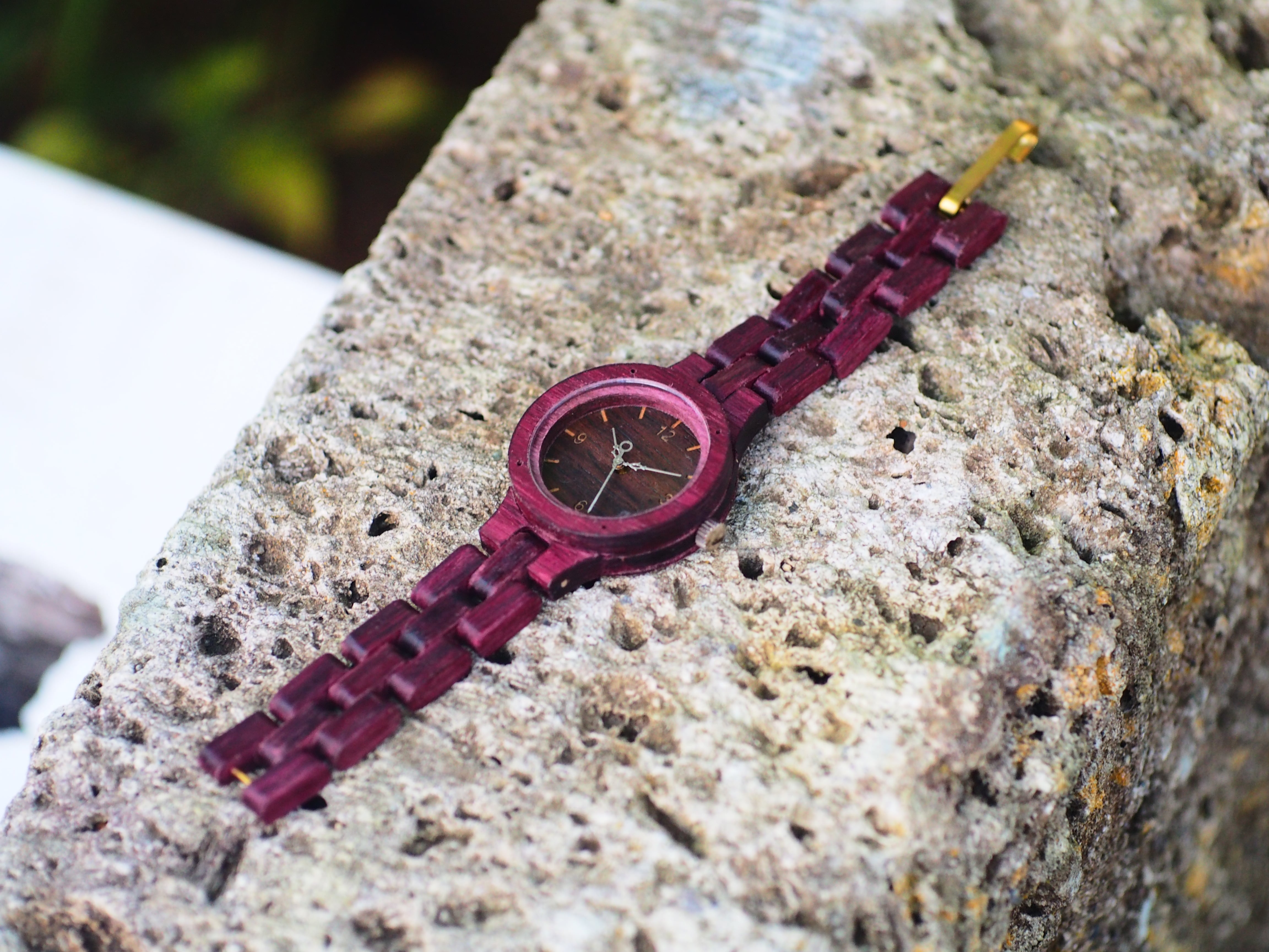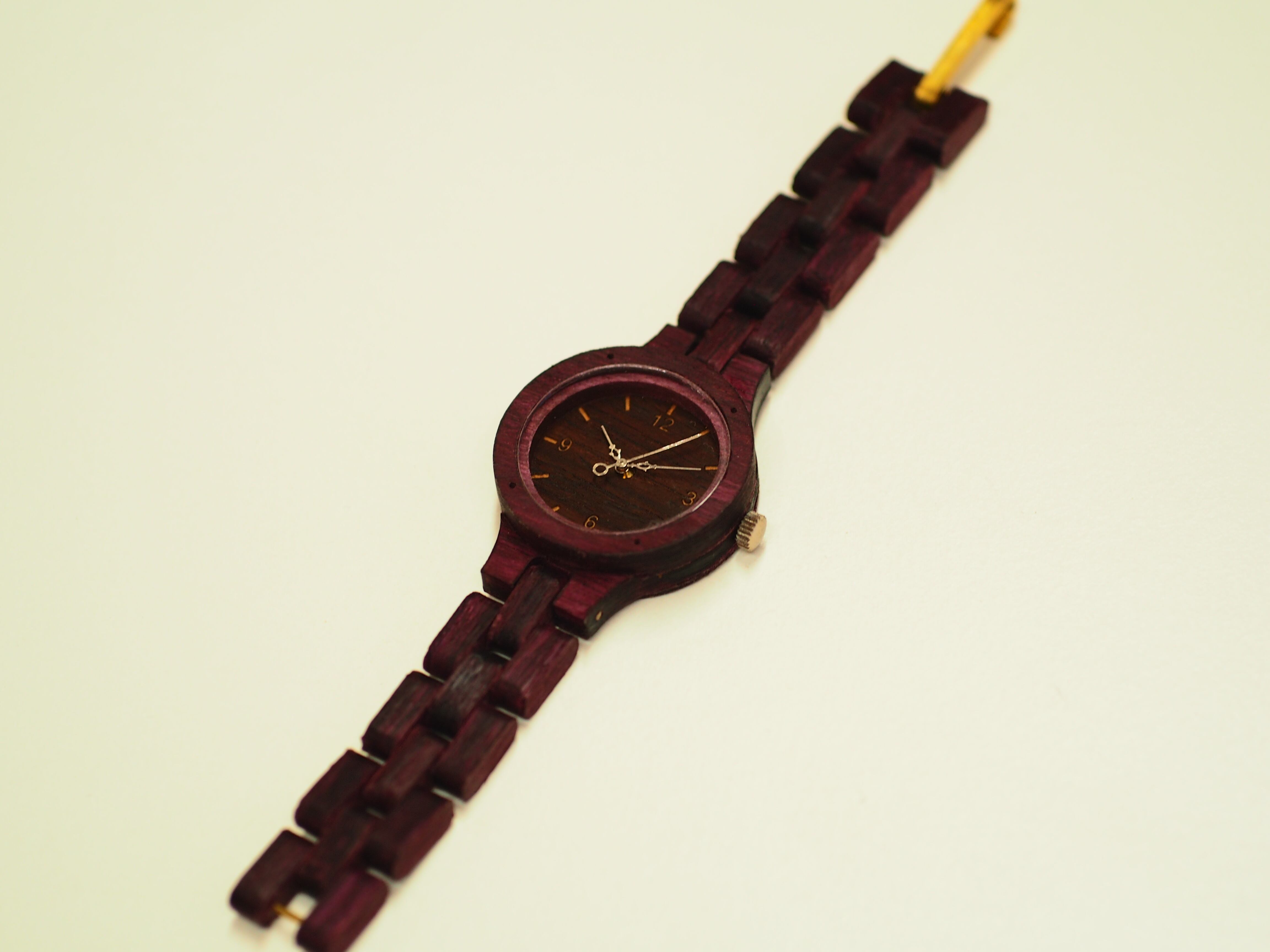 貴重な木材「パープルハート」を用いた木製腕時計。