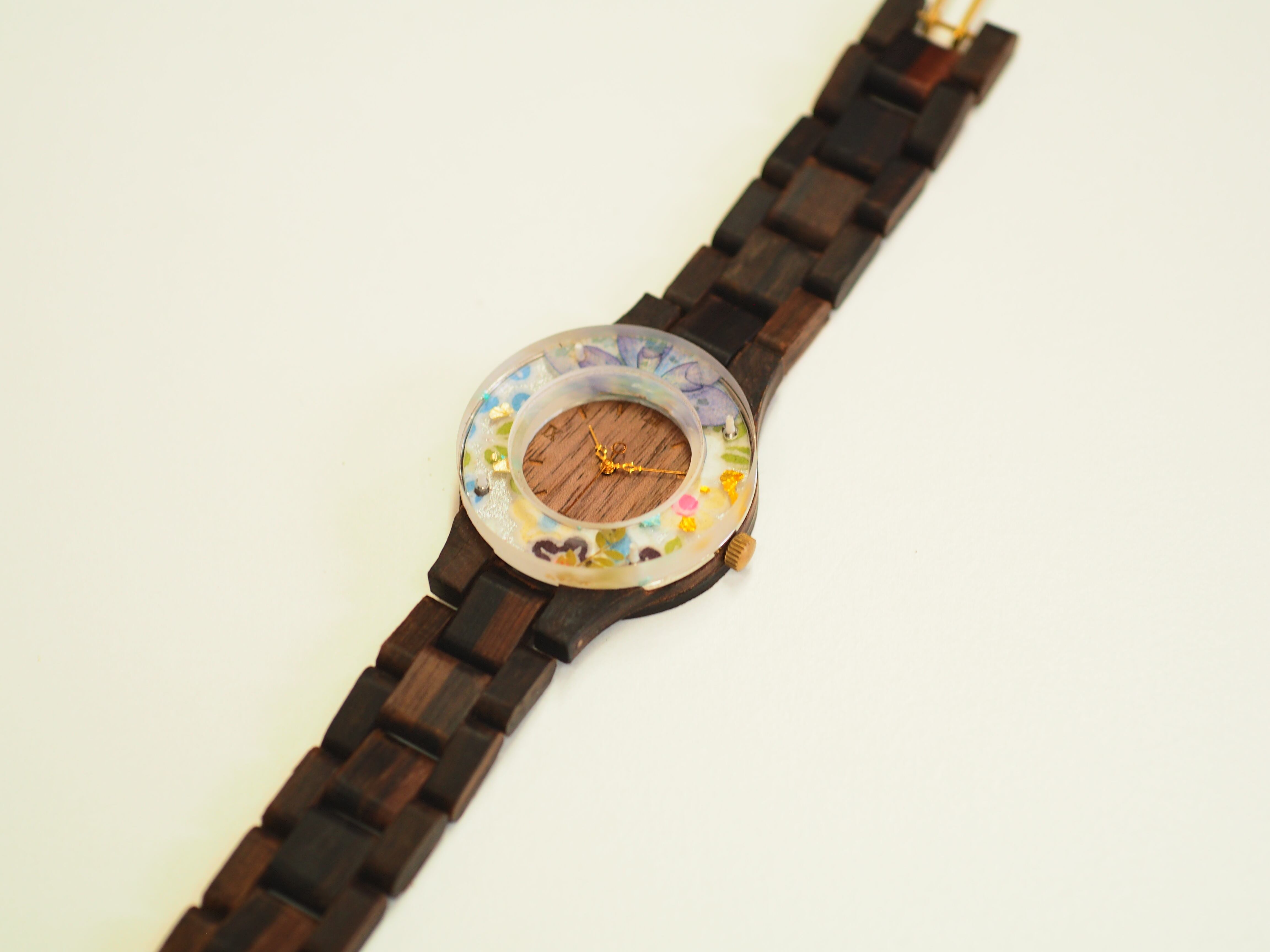 こちらの時計は大きく、紫陽花がはっきりとわかる腕時計となっています。