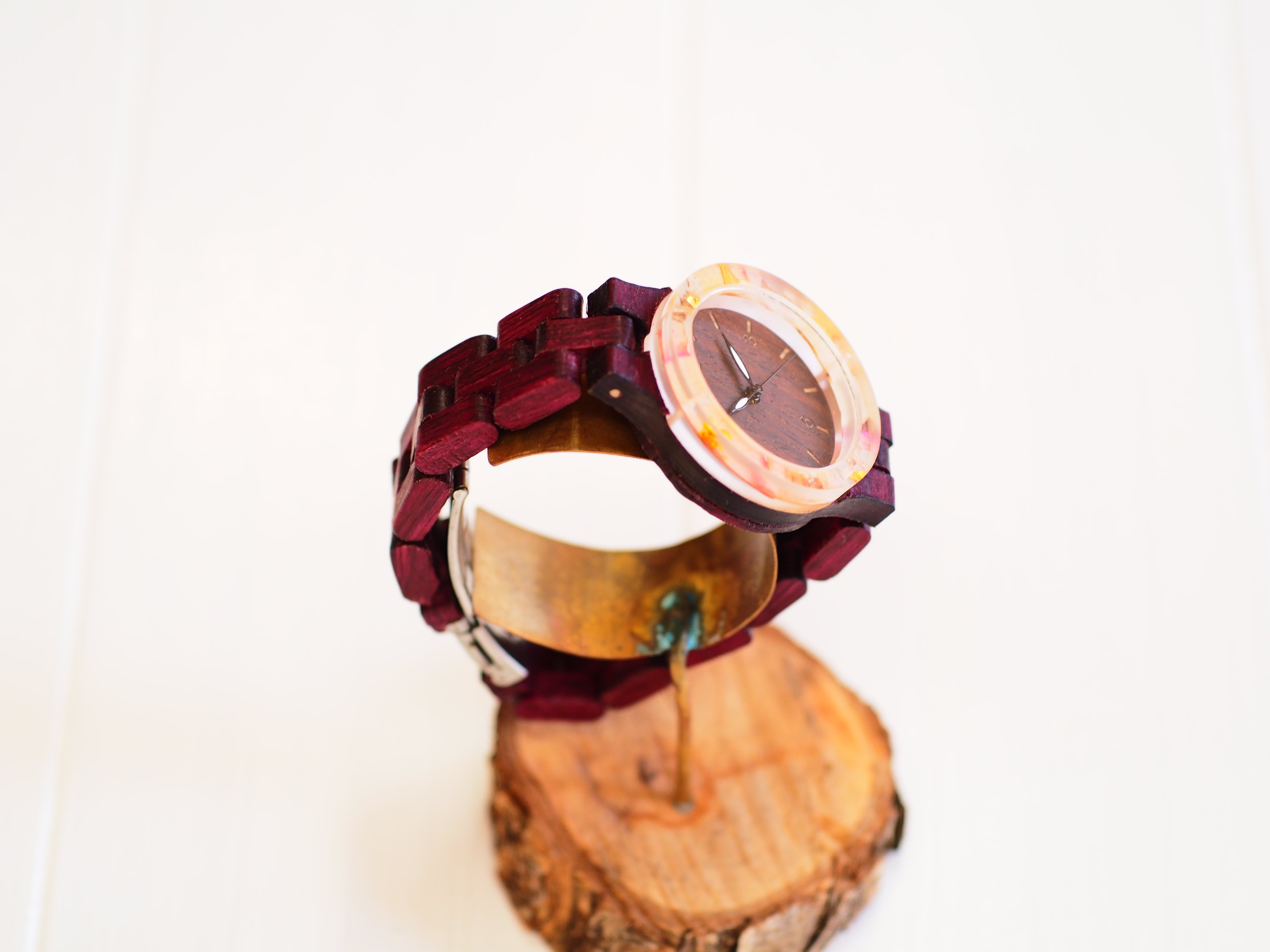貴重な木材「パープルハート」を用いた木製腕時計。