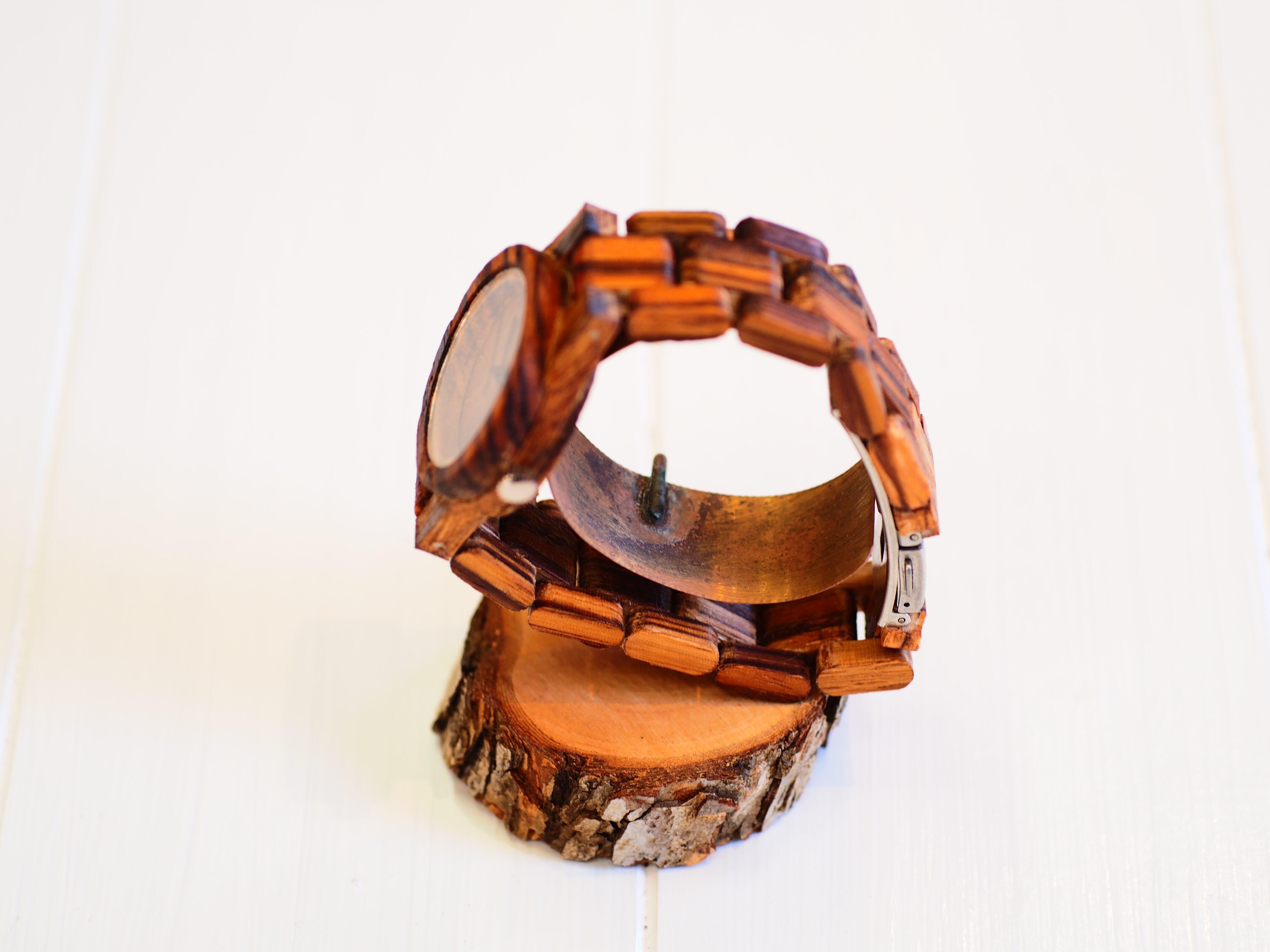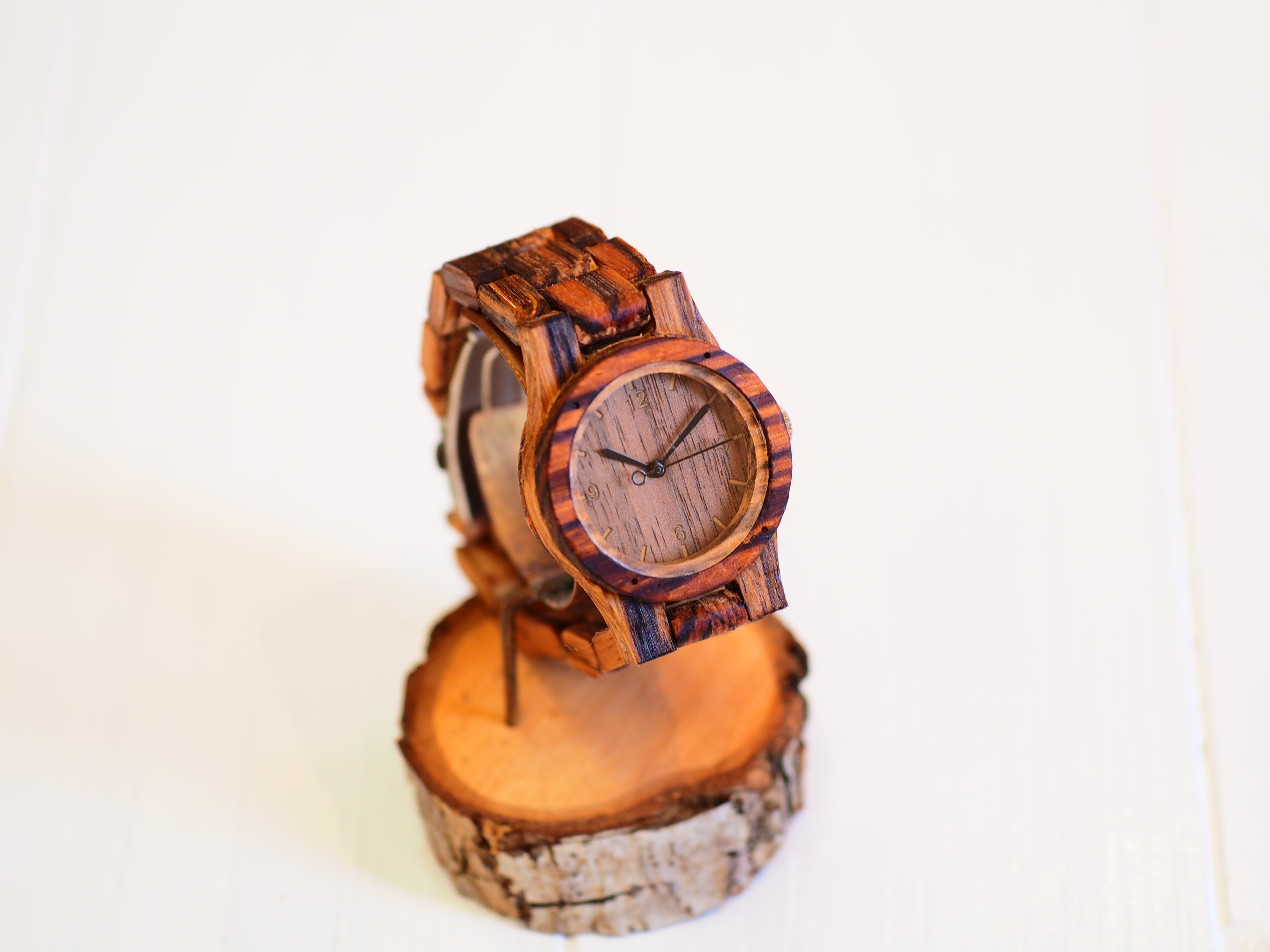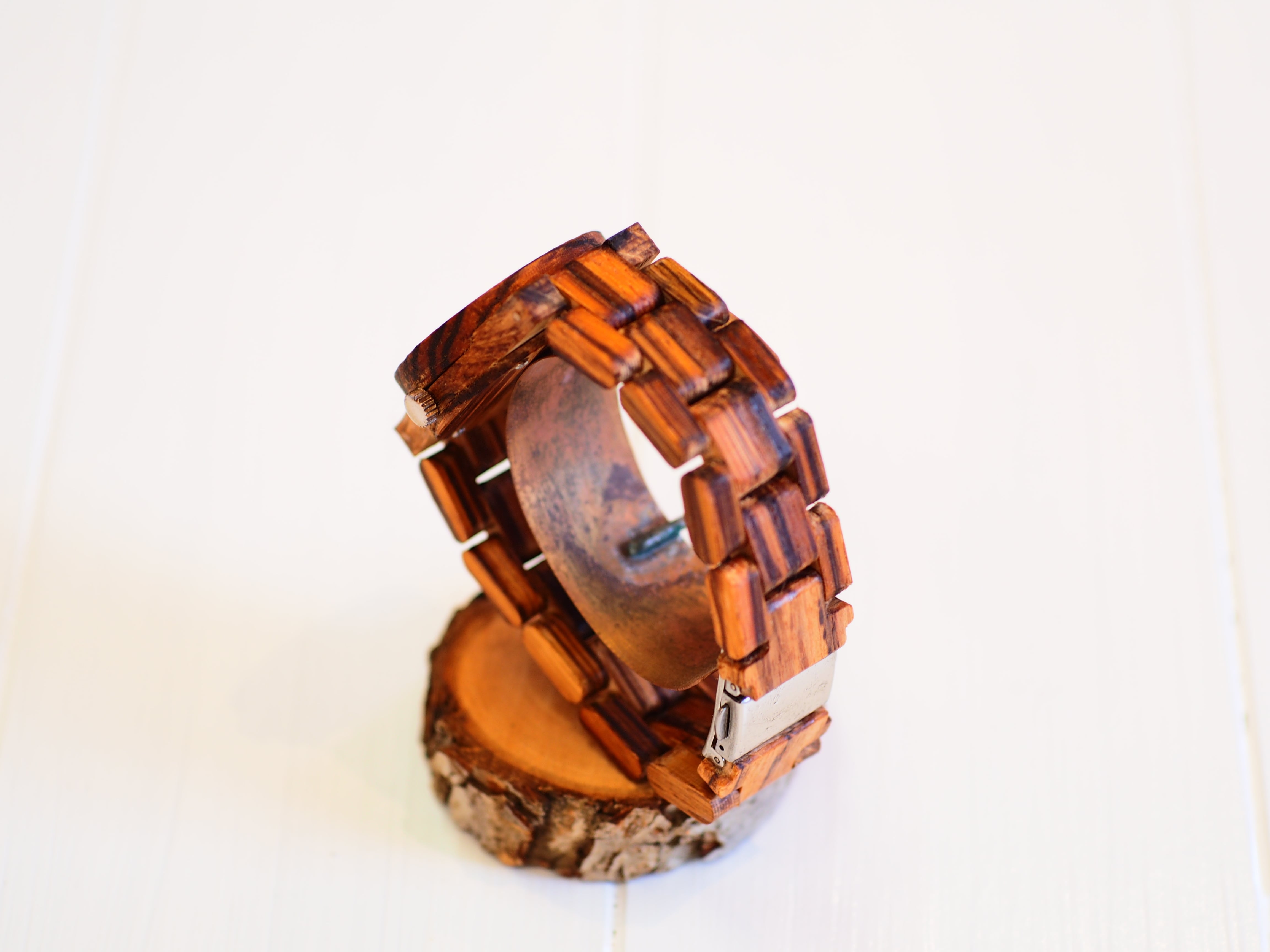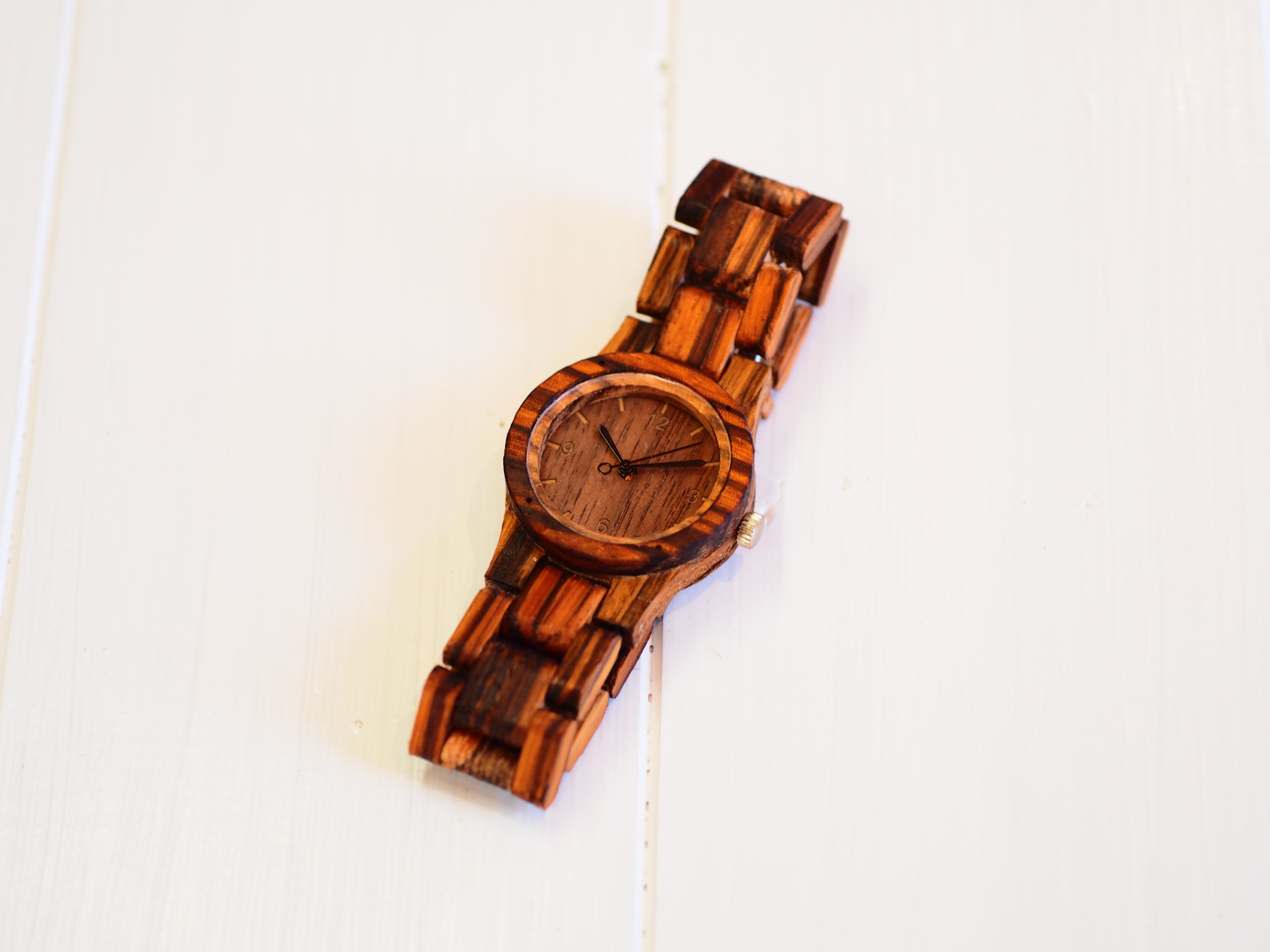 木目がはっきりとした木材「ゼブラウッド」を用いた木製腕時計。